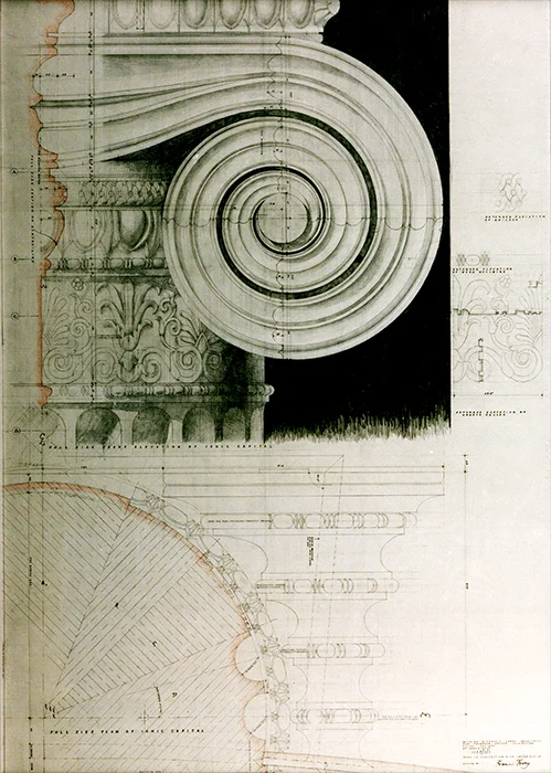 Full size working drawing of Ionic Capital. Drawn by Francis Terry. Exhibited at the RA, 2004.