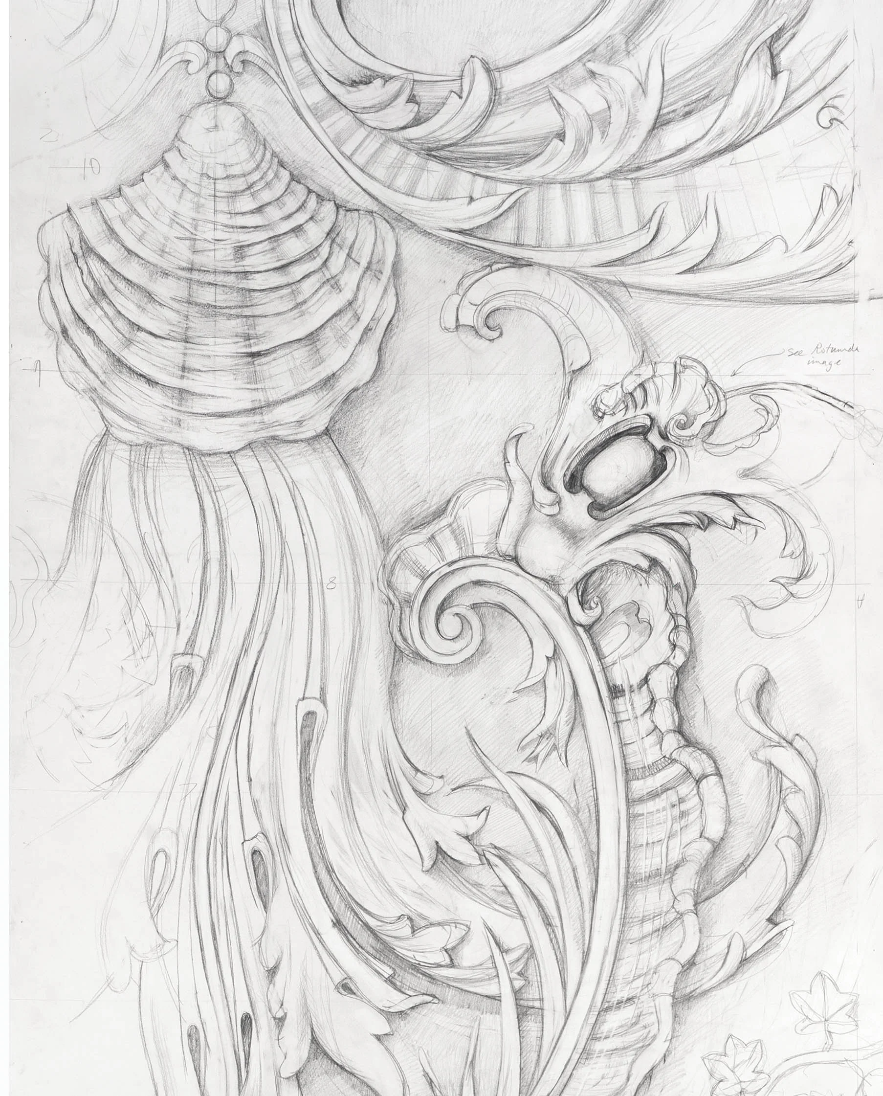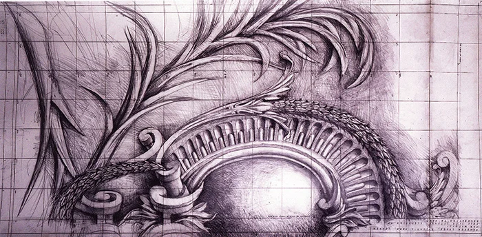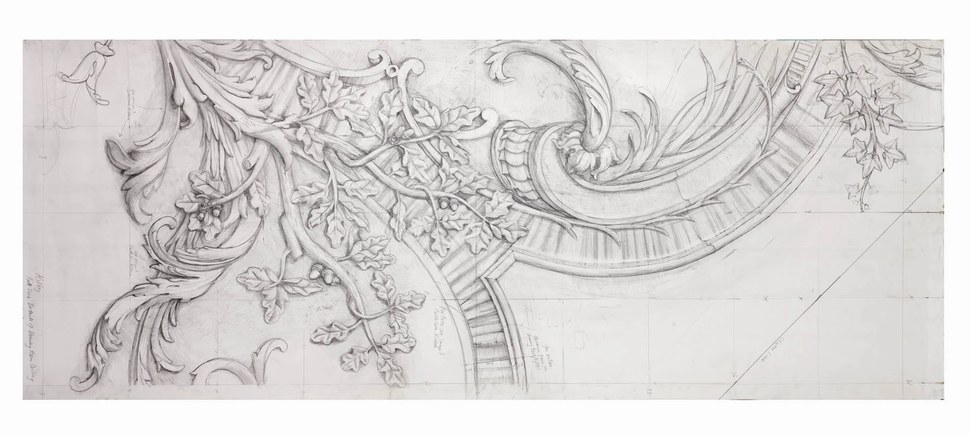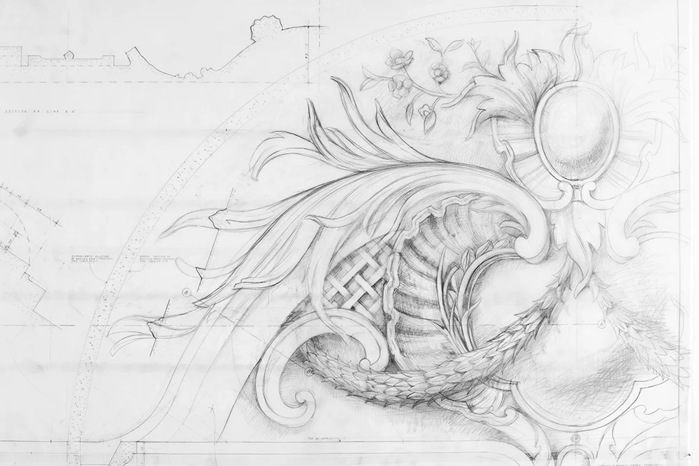 Full size detail of decoration for Kilboy. Drawn by Francis Terry, pencil on paper. Exhibited at the RA in 2002.