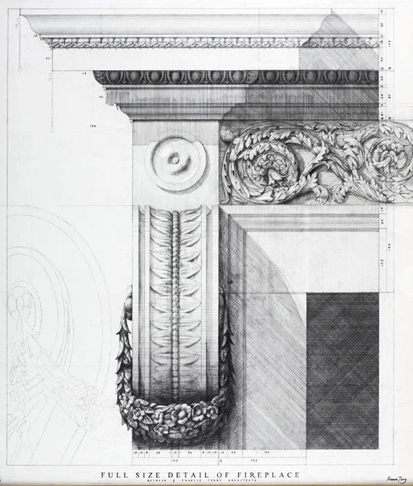 Fireplace design for Hanover Lodge. Drawn by Francis Terry. Pencil on tracing paper. Exhibited at the RA in 2007.
