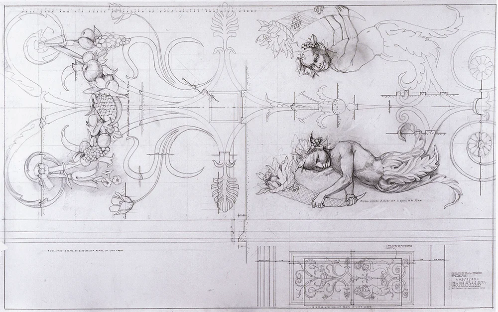 Plaster work decoration with figures. Drawn by Francis Terry. Pencil on tracing paper. Exhibited at the RA in 2006.
