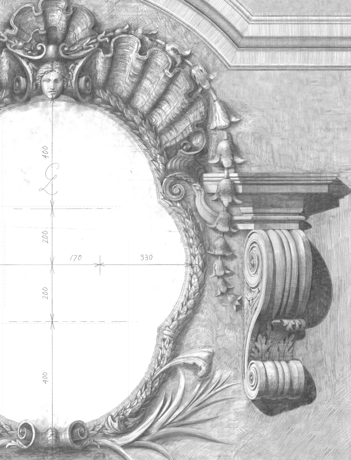 Full size Cartouche. Tapestry Drawing Room, Castle Howard. Drawn by Francis Terry 2023