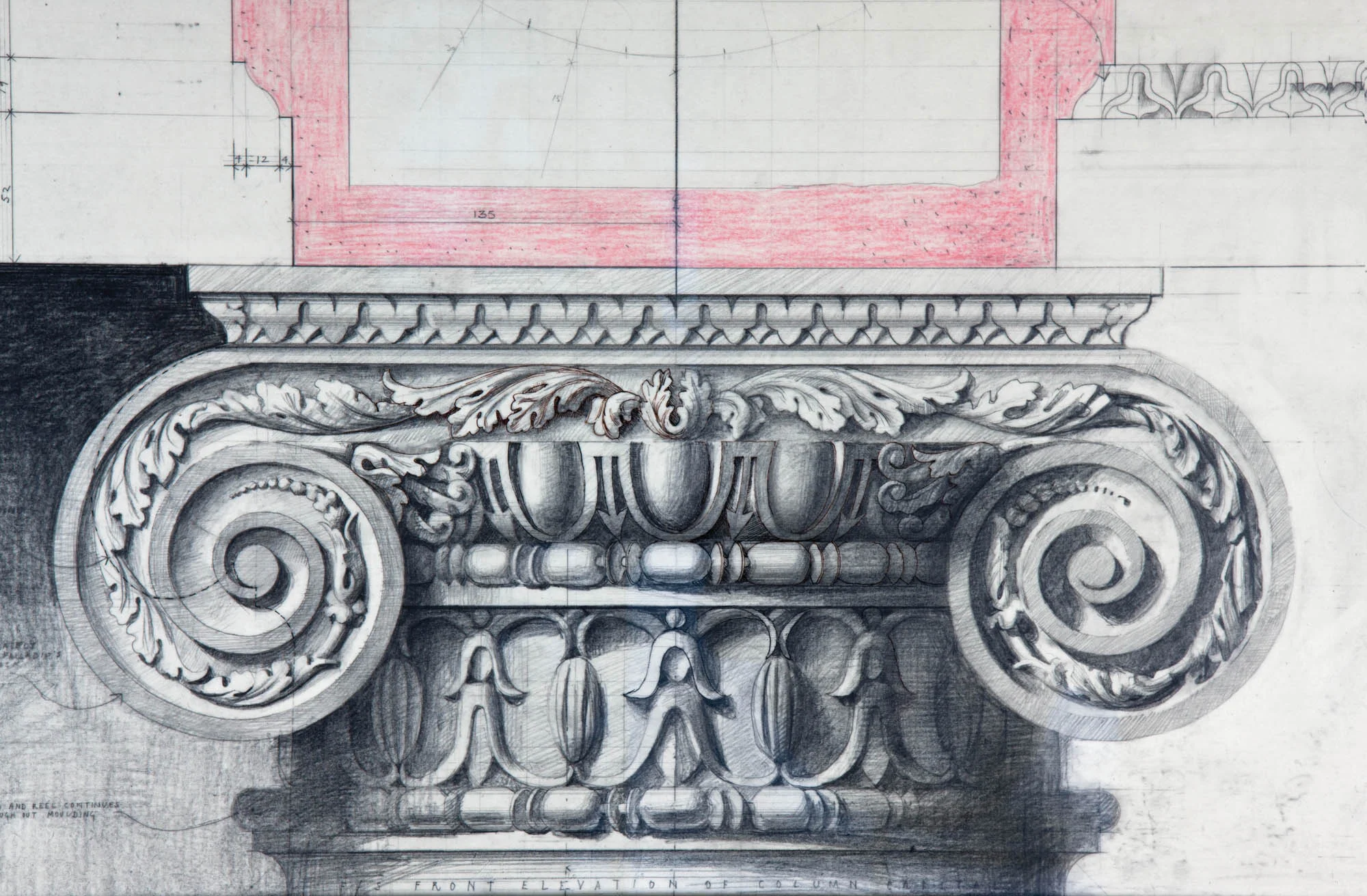 Full size working drawing of ionic capital for Hanover Lodge. Drawn by Francis Terry. Pencil on paper, 2006.