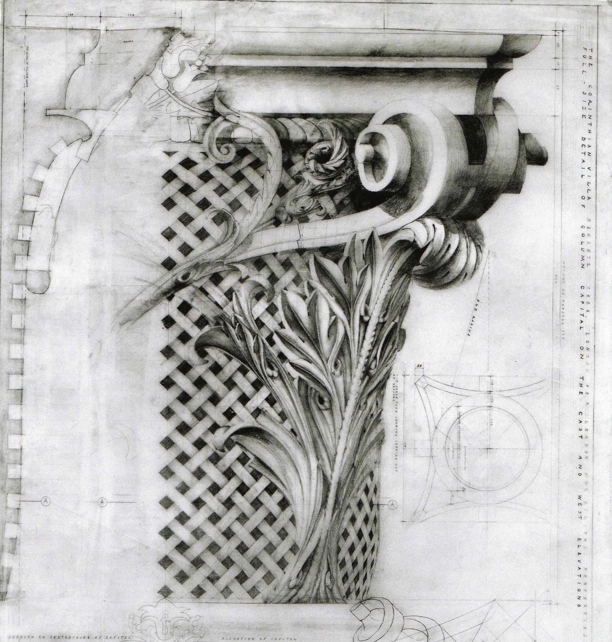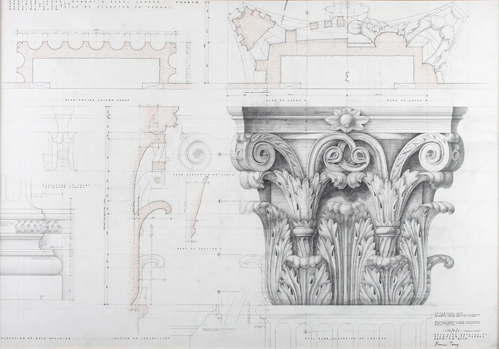 Full size working drawing of Corinthian Capital for Hanover Lodge, by Francis Terry. Pencil on tracing paper. Exhibited in the Three Classicists exhibition at the RIBA 2010.