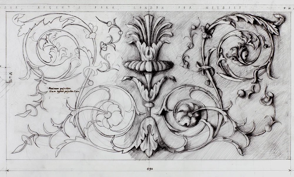 Full size working drawing of rinceau panel for Hanover Lodge. Drawn by Francis Terry, pencil on tracing paper. Exhibited in the Three Classicists exhibition at the RIBA 2010.