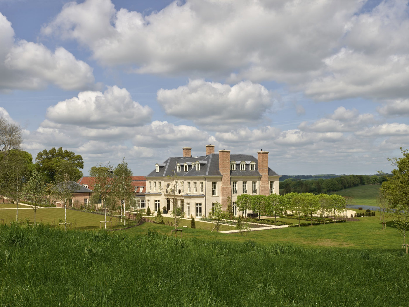 The precise positioning of the new house is a crucial factor in its success. The modern farmhouse that previously stood on the site was located higher up the slope and on the same level of the ancient woodland, whereas the new site was chosen to be lower. Therefore, the new house is sheltered in the contours of the landscape and allows views to the north-west, without breaking into the well-established tree line. This allows for a more private, terraced garden area south of the principal range, created to designs by Mr Sweet, and for the parkland to sweep up to the house to the north and west. There was a strong sense that the building should gracefully ornament the survived landscape—not dominate it—but give it a pleasing visual focus. Mr Sweet took inspiration from major examples of Humphry Repton’s work for the way they engage with their surroundings to develop a new plan.