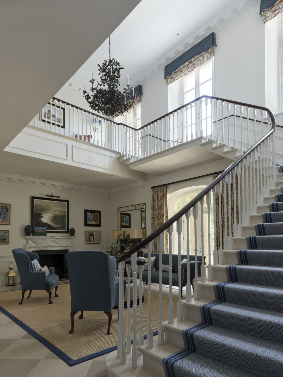 In terms of ‘classical continuity’, it is interesting to reflect how this house can be linked to the principal country house in the near vicinity, Moundsmere Manor, which was designed by Sir Reginald Blomfield and built in 1908–09 in an ambitious late-17th-century or neo-Wren style. Blomfield, who wrote The Formal Garden in England (1892), also laid out the gardens there and the estate features a pair of lodges in a simplified neo-Georgian style. Other Arts-and-Crafts and Classical-inspired houses that became part of the design conversation include nearby Marsh Court by Edwin Lutyens—a dramatic clunch-built house on a sloping site near Stockbridge, constructed for the investor Herbert Johnson in 1901–04—and Lutyens’s stone-built Middleton Park in Oxfordshire, created in the 1930s for the Earl of Jersey and his American countess. Airy 1920s Long Island houses, combining English and French influences, with their notably generous scale and fluid plans, also played a part in discussions about the evolving design.