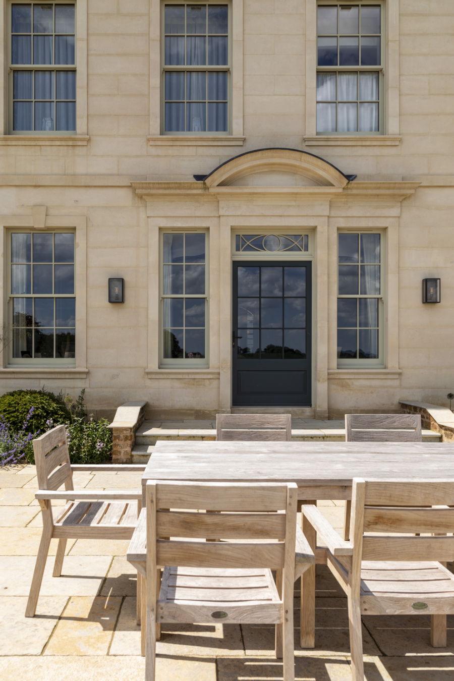 To give variety to the composition and to mark out this modern Classical house from historic precedents, large expanses of limestone were incorporated at the centre of both the main elevations of the house to the west and east. This treatment gives them weight and an inviting presence. The mansard roof over the house, slightly French in character, is covered in natural dark-grey slate with lead dressings and rolls. Mr Terry and his associate Martyn Winney worked closely with Kingerlee of Oxford as contractors, specialists in stone masonry work. In the manner of early 18th-century buildings, the cornice is in painted timber and, as at Belton House in Lincolnshire, the timber is painted to match the stone.