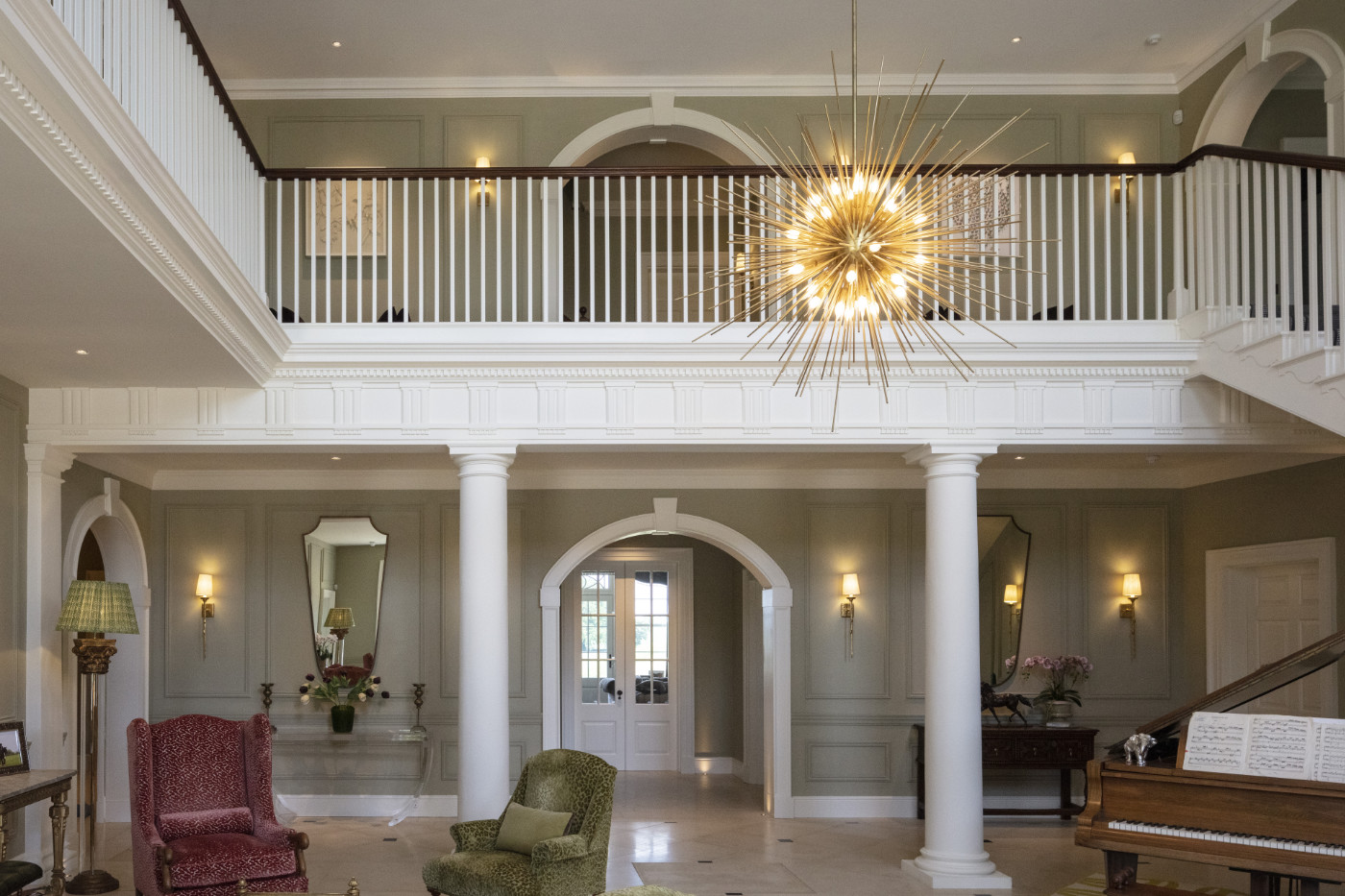 The interior planning is similarly a mixture of traditional and modern, with a generous double-height hall, where a staircase leads to a galleried landing. The other principal rooms are arranged around this light-filled space, which can double as a reception room for larger entertainments; the modern family kitchen fills the south side of the house, whereas the main drawing room and dining room fill the rest of the west front and are interconnecting. The bedroom suites are approached from the galleried landing, which acts as a kind of axial corridor on the first floor. The mansard-style roof means there are also generous rooms within the attic storey, including a broad sitting room at its centre.