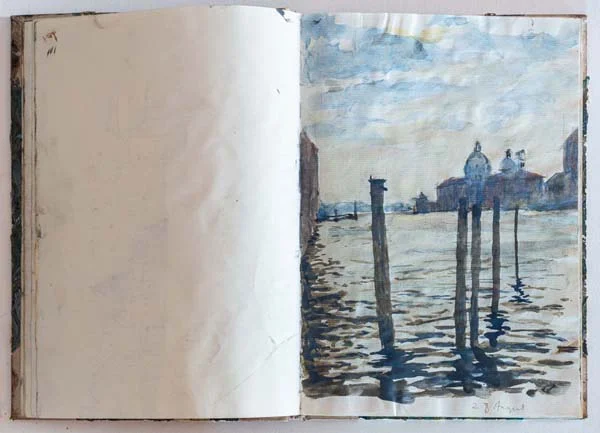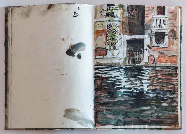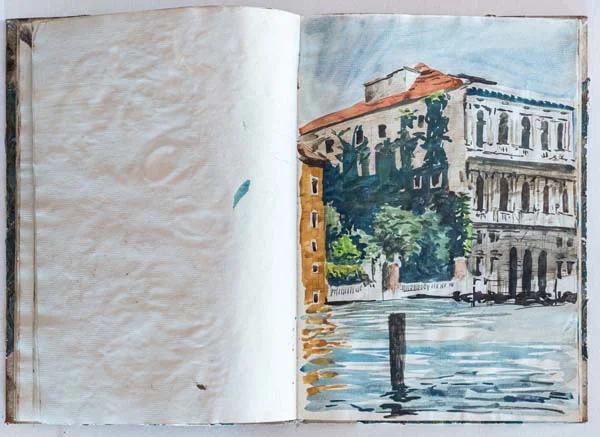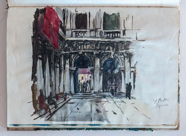 In the late ‘80 I had a sketchbook with a marbled cover, this I imagine was bought in Venice where shops full of marbled knickknacks are on every street corner. The first sketches in this book are watercolours – unsurprisingly of Venice. I was by now moving away from my tried and tested pen and ink with watercolour technique and starting to use watercolour by itself.
