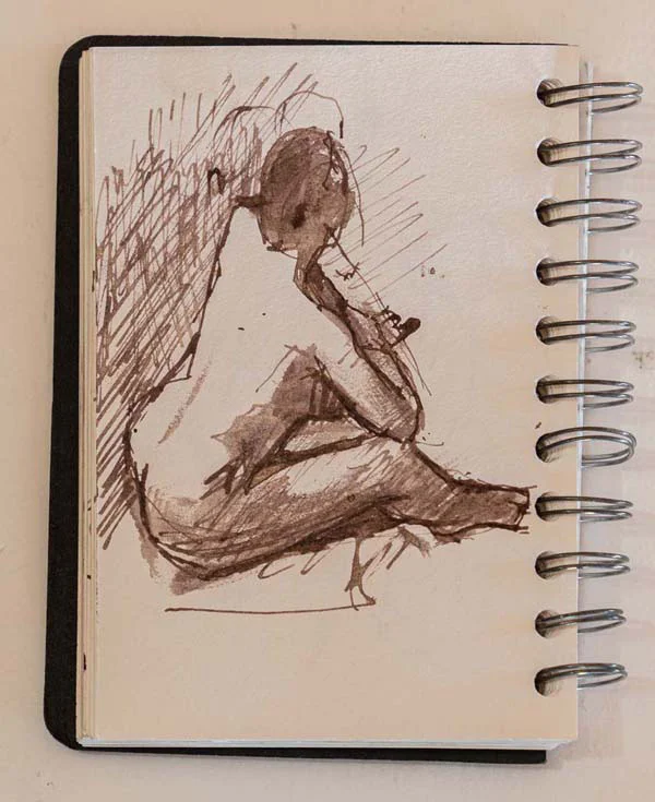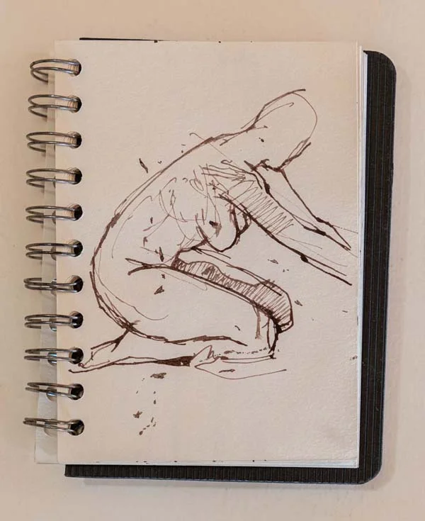 That black sketch book is pretty much the last sketch book I have done, and it is about ten years old. Though I seem to spend more time sketching and painting than I have ever done, I prefer to use loose pieces of paper which are easier to handle, particularly for scanning and photocopying, and so now rarely use sketch books, if at all. As well as this, I find sketchbooks constraining and sometimes intimidating. How hard it is to draw spontaneously in the first page of an expensive book full of blank white pages. Also, if I do a really good sketch, I want to rip it out to give someone as a Christmas present or, conversely, if I do a poor drawing I want to rip it out so no one ever sees it.