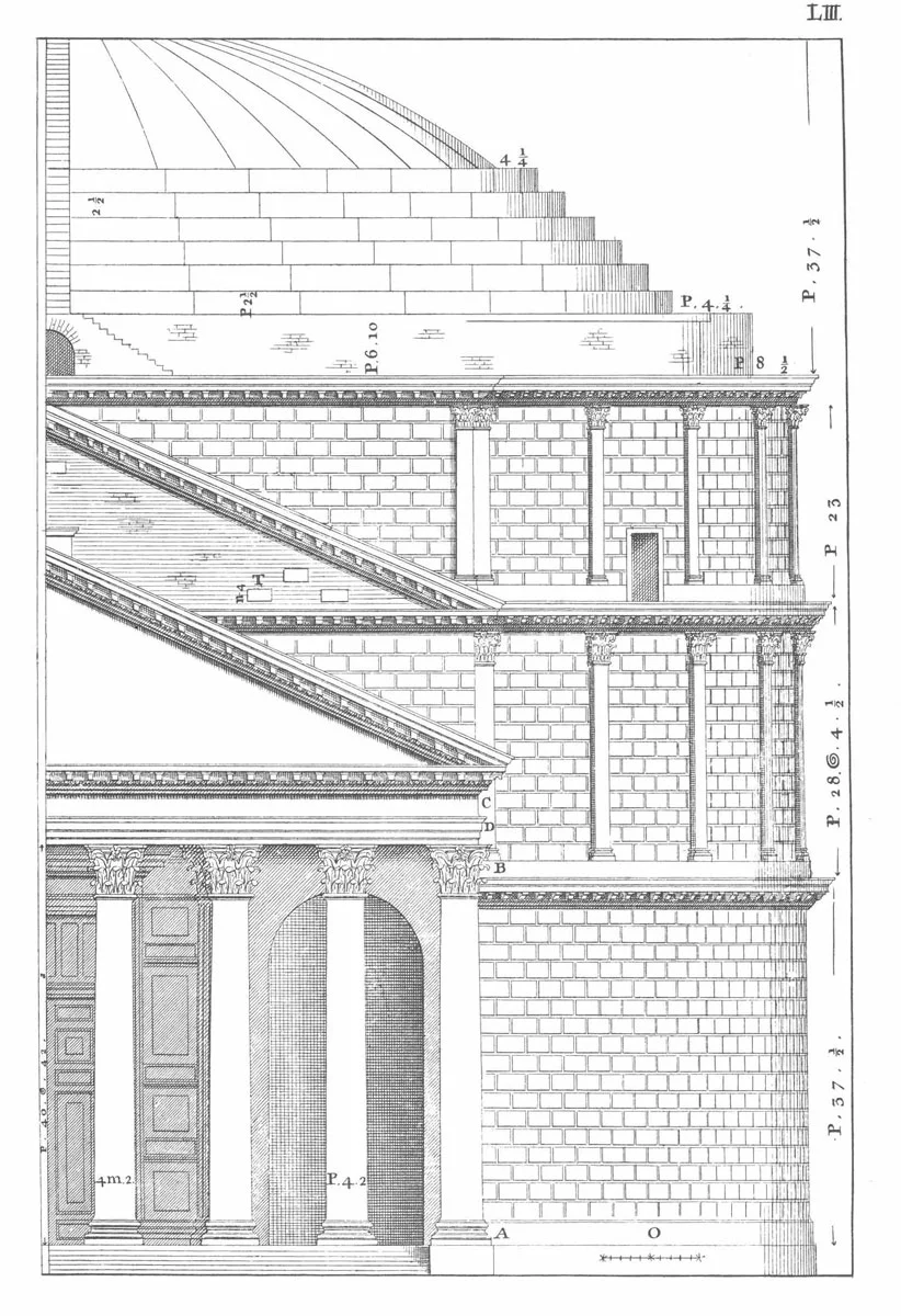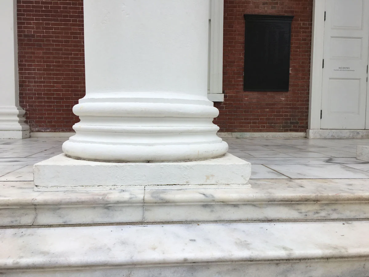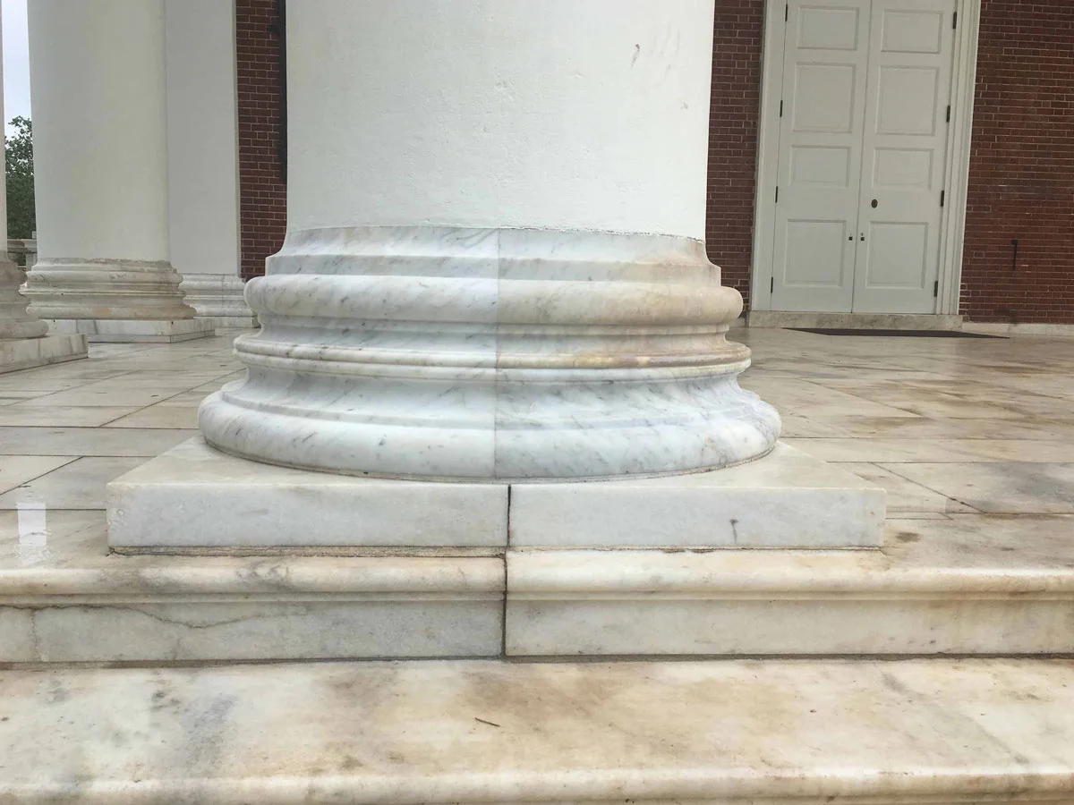 The Rotunda which is the jewel in the crown of Jefferson’s design is based on Palladio’s drawings of the Pantheon in Rome (Book Four plate LI to LX). Excellent though this building is, it is a far cry from the Pantheon in terms of size, materials and function. But to his audience, who had never been to Rome, this would perhaps resemble the real thing. This building has suffered a fire and much restoration and so it is hard to know what is original. On the portico that faces the road, the column bases have the unusual single astragal between two scotias profile, it made me think that perhaps Jefferson was looking at Vignola’s treatise as well as Palladio’s, but I then discovered that this was a later addition by McKimm, Mead and White, which makes perfect sense. The Jefferson portico on the lawn side has the conventional double astragal, in imitation of the Pantheon – as I’d expect.