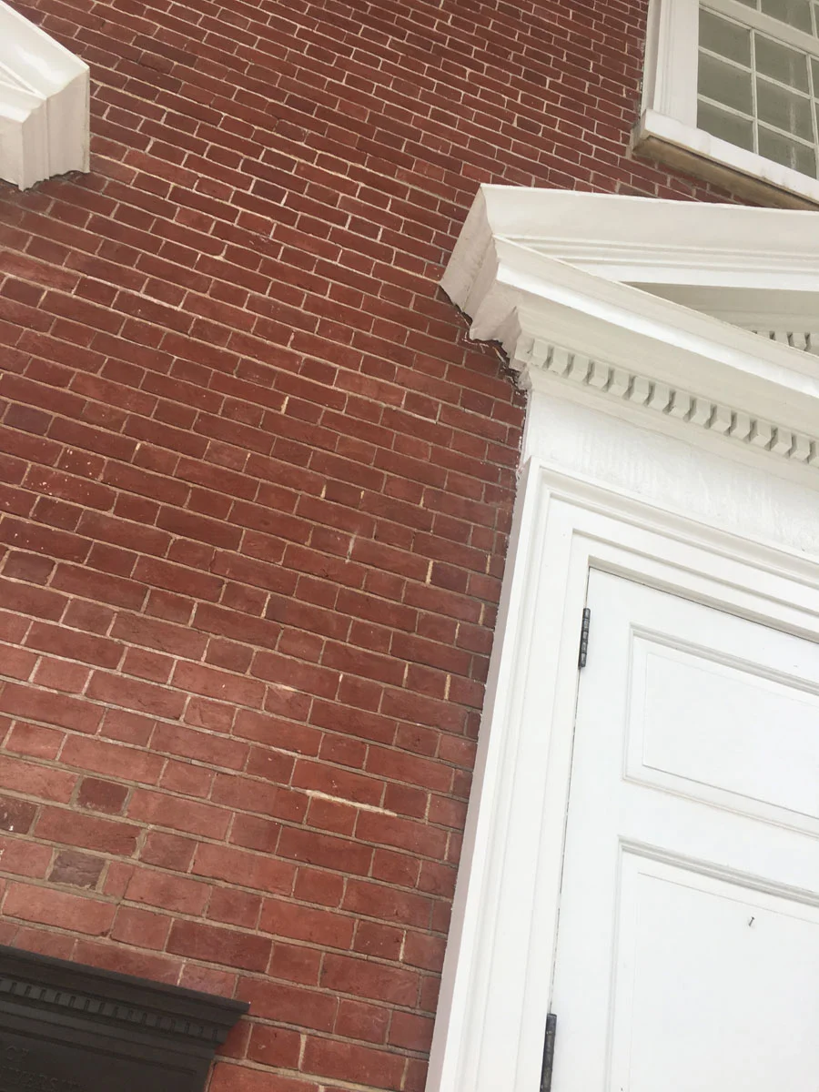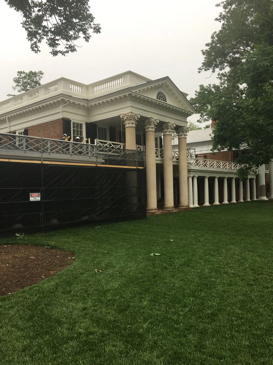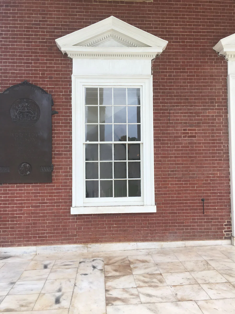 There is extensive use of painted formed sheet metal (perhaps zinc) in imitation of stone or wood for window surrounds and the entablature to the porticos. It works surprisingly well although I doubt very much that this is a material which Jefferson would use.