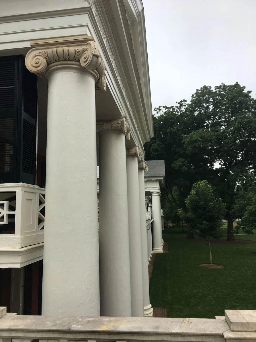 This pavilion has been restored, perhaps controversially, using a stone colour which Jefferson would have originally used for the architectural elements rather than white. The university now has a dilemma whether to go with what Jefferson intended or continue with the white which the alumni know and love from their student days. If I had the choice, I would continue with the stone colour. At this building they have also reinstated the parapet above the pediment which was a feature of some of the other pavilions as well.