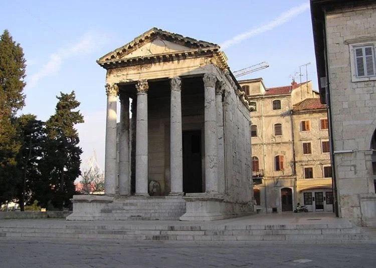 Pavilion II is based on the Roman temple of Fortuna Virilis, as drawn by Palladio on plates XXXI to XXXIII of Book Four. Jefferson has even given it the awkward corner capitals, which Palladio shows in such in such detail. The distinctive swag frieze has also been faithfully reproduced.