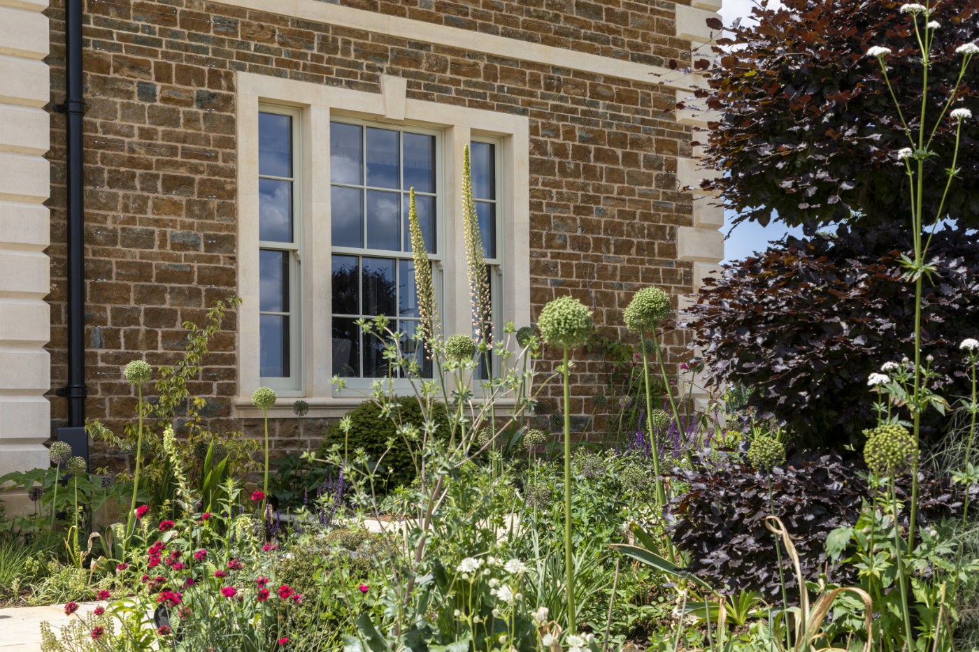 The interiors have been finished in a blend of traditional and contemporary style that suits the house well, including Zoffany wallpaper in the drawing room, a long kitchen table by Julian Chichester and a dining table and large set of late-17th-century-style chairs acquired from nearby Thorpe Mandeville Hall. Helen Wallace Interiors gave advice on the decoration, Lucy Martin on the lighting, and Rebecca Bannerman on the exterior lighting. The gardens were laid out by garden designer James Alexander-Sinclair, with planting concentrated close to the terraces on the south and west of the house; the lawns are left open to preface the fields and paddocks beyond.